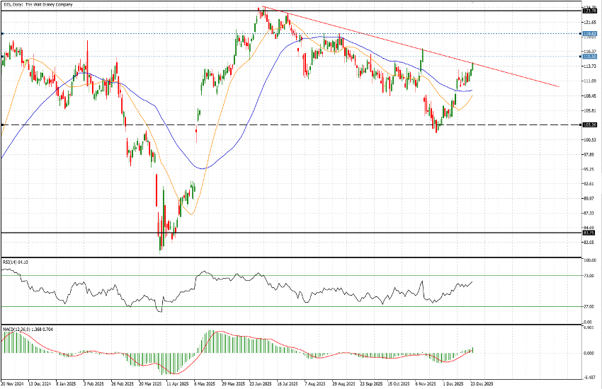 The daily chart presents a more promising outlook, or at least the potential for one in the near term. As of the December 24 close, the price is testing a descending trendline that has historically capped gains. A breakout above this trendline before year-end would be a bullish signal, clearing the path to retest the $124 resistance level, though the stock must first navigate intermediate hurdles at $115.50 and $119.60. Constructive momentum is further supported by the RSI and MACD indicators, both of which are trending positively. Additionally, the price has recently reclaimed its 21-day and 50-day moving averages. Notably, these averages are converging toward a bullish crossover (Golden Cross), with the fast moving average trending upward.