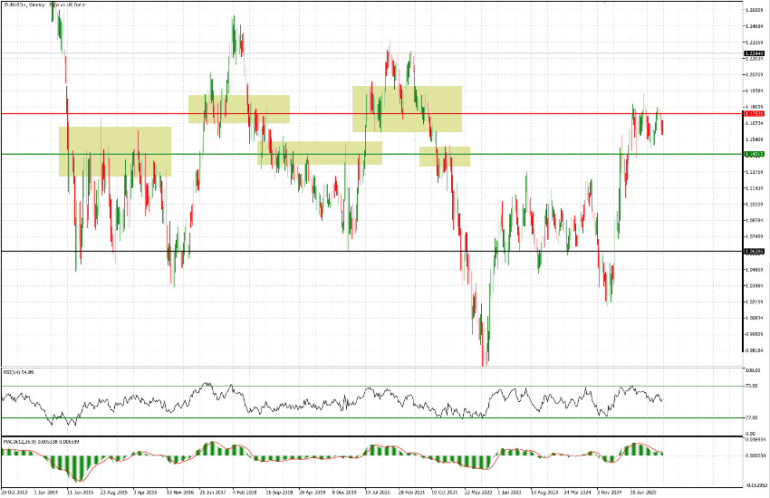 We begin with a very long-term perspective—covering the past ten years—consistent with the conviction that any financial instrument should first be assessed within a broader timeframe in order to understand its historical positioning before moving to finer levels of detail. In the weekly chart below, the relevance of the levels around which the pair has traded over the past six months is clearly visible: on the downside, the area around 1.1420, and on the upside, around 1.1750, have repeatedly acted as strong support and resistance levels in the past—most notably in 2015, during the 2017–18 period, and again in 2020–21. It is therefore not surprising that, following the rally in the first half of last year, EUR/USD has paused to consolidate within this broad range.