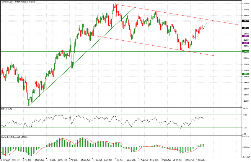 Despite the prospect of a rate cut—or perhaps precisely because it is already largely priced in—from a technical standpoint GBP/USD could extend modestly higher, potentially testing the 1.35 area, where it would encounter the descending channel. Any sustained breakout (not expected today, and for which there is currently insufficient evidence to assess the probability) would nonetheless require confirmation above 1.36.