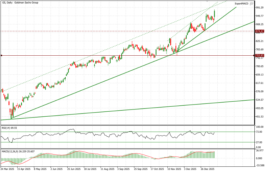 The daily chart of Goldman Sachs tells the story of an almost exceptional year. At the beginning of spring 2025, on 8 April, the stock was trading at USD 442; it closed yesterday at USD 974.27, marking a gain of approximately 120% over the past nine months.