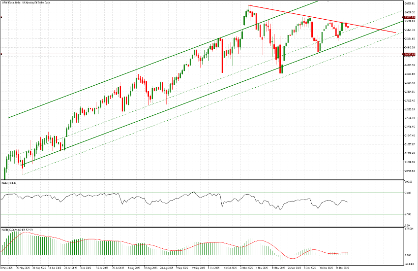 As a result, the Nasdaq (US100) is underperforming both the S&P 500 (US500) and the Dow Jones (US30), struggling to establish a clear directional trend and continuing to trade sideways at elevated levels, within a range between 25,000 and 26,000.