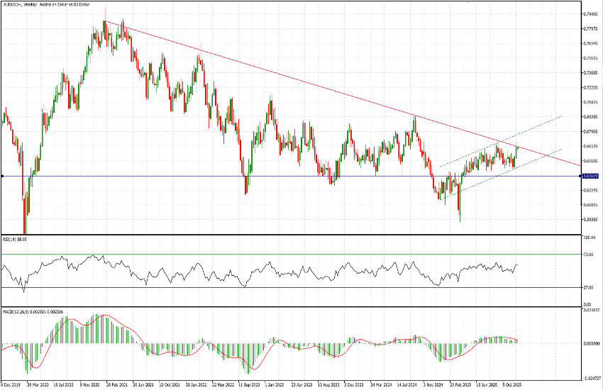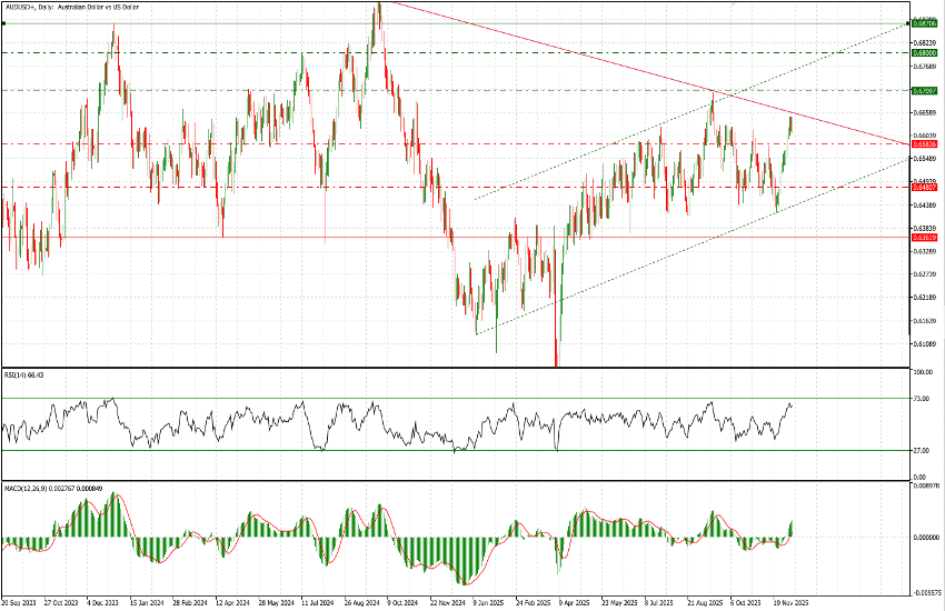 AUD/USD began the year around 0.62 and has since climbed slowly but steadily—setting aside the tariff-related volatility in April—to the current level near 0.6638. In fact, throughout the second half of the year the pair has largely traded sideways within a range between 0.6460 and levels very close to the current 0.6620. Only in late September did it briefly test 0.6703, a level that now appears to be the next directional target. The pair has recorded 13 consecutive sessions of gains, naturally pushing key indicators (RSI, MACD) into firmly constructive territory.