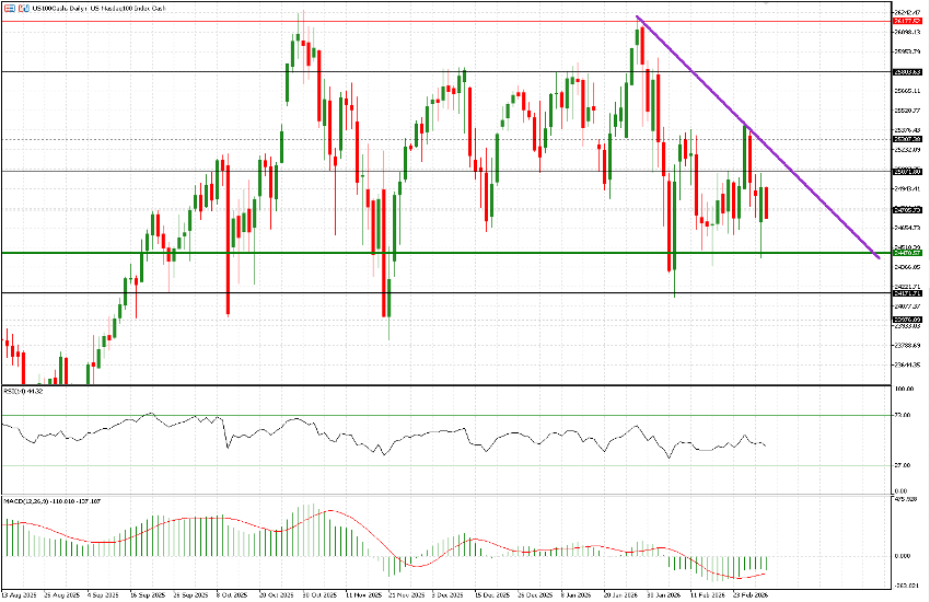 Let us begin with the US100. After opening below last Friday’s low at 24,700, the index declined to test 24,470 — an area that proved particularly significant between September and October, and again in mid-November. From there, a rebound carried prices close to 25,050, a level that had been tested multiple times from below in February before a mild pullback led to a close at 24,954. Although the index has been trading within a broad six-month range, it is now clearly positioned below a descending trendline.