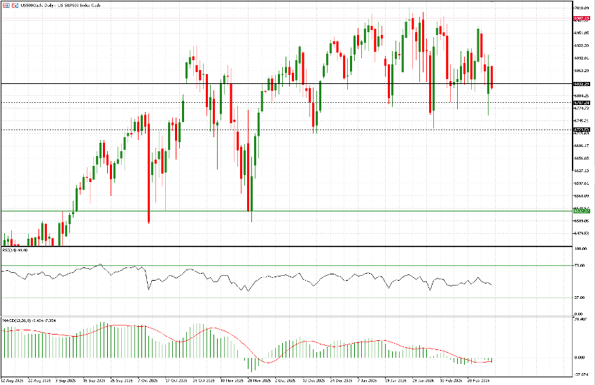 Finally, the US500: it has also been trading within a range for at least three months, with the 6,830 level acting as a key pivot throughout 2026. Yesterday’s opening occurred below that threshold, and the index fell beneath the year’s lowest closing level (6,758) before staging a $140 rebound to 6,899. This morning it is once again trading below 6,830, and 6,723 appears to be a level that is likely to be tested sooner rather than later.