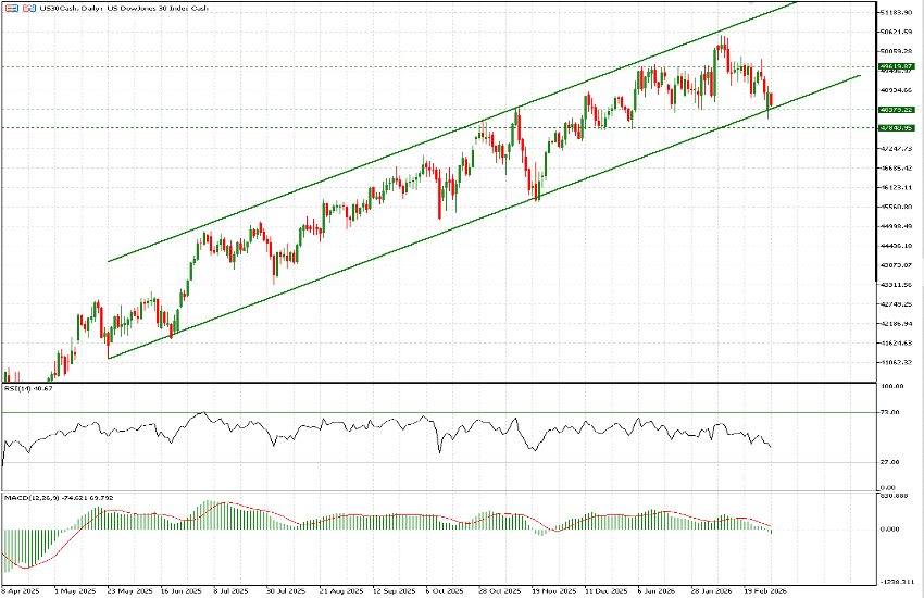 The US30 is particularly interesting, having been the strongest among the major U.S. indices in recent months. Yesterday’s opening occurred precisely on the ascending trendline in place since May 2025. The trendline was briefly broken to the downside, but buying interest emerged and prices rebounded cleanly from that level. This morning the index is down 0.72%, bringing it close to another test of that same trendline just 24 hours later.