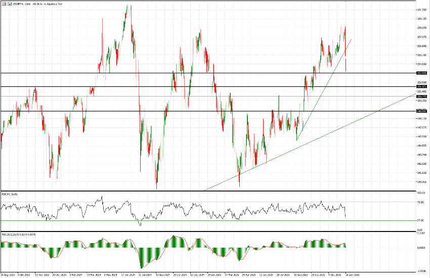 Turning to the daily chart, there are several downside static levels worth monitoring. The most relevant are around 152 and, further below, the 149 area—where the aforementioned long-term bullish weekly trendline would also come into play. The shorter-term uptrend that began in September has been broken over the course of just two sessions.