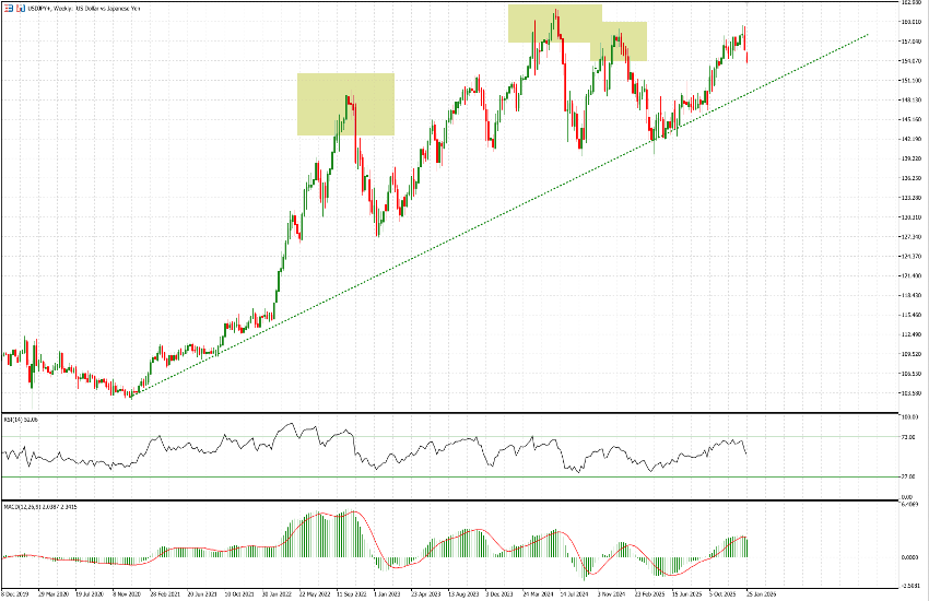 We begin with a weekly chart highlighting the three previously mentioned intervention episodes. As shown, the first intervention occurred at lower levels, when the pair peaked around 151, whereas in subsequent instances authorities allowed USD/JPY to extend much further, up to or close to the 160 area. This year, the pair reached 159.50 just two weeks ago and is currently trading around 153.95.