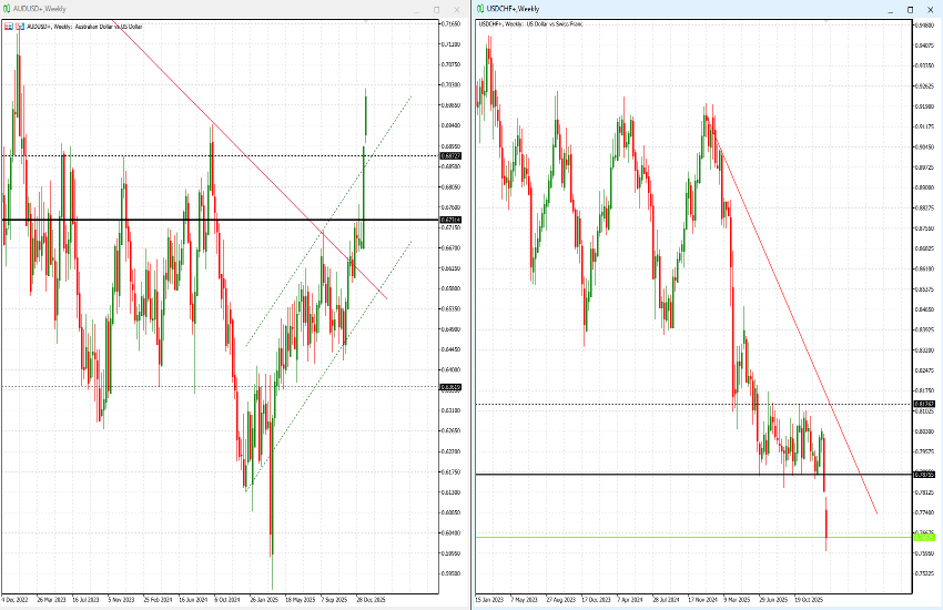 Given the breadth of moves, it is not possible to cover all pairs in a single note. We therefore begin with the most significant developments, starting with AUD/USD, which has gained +4.86% , settling +1.29% yesterday at 0.6997. The pair decisively broke through resistance in the 0.6700–0.6740 area and—importantly—initiated its rally ahead of most other major currencies. One of the key drivers of renewed USD weakness has been a market rumour that emerged last Friday suggesting that the Fed’s trading desk may be preparing for a potential coordinated intervention with Japan to stem the yen’s depreciation. Such an intervention would involve buying JPY and selling USD, whether in the spot market or via swaps. Against the Australian dollar, however, the move had already begun earlier, likely supported by the strength in gold, of which Australia is a major exporter.