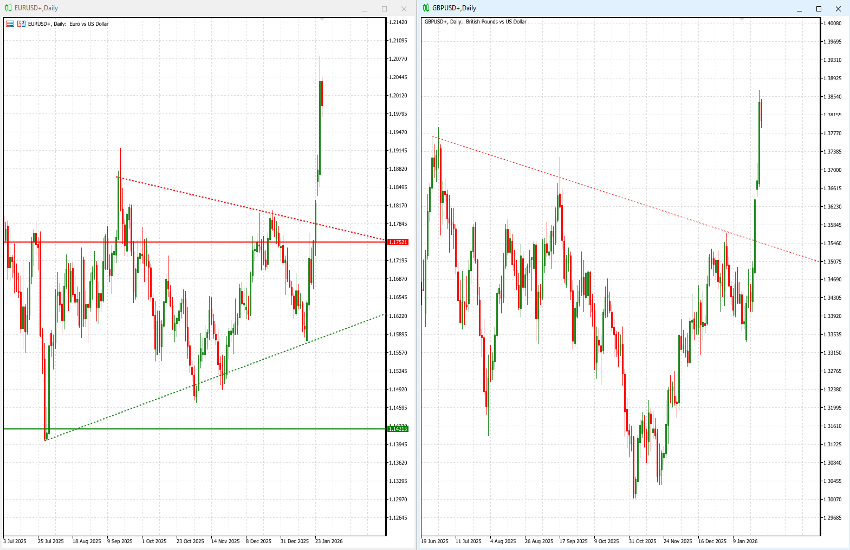 After months of relatively subdued volatility in FX markets, conditions have shifted abruptly. Over the past four sessions, the USD Index has recorded its worst performance since April 2025 (the days following the initial tariff announcements). With a -0.83% decline yesterday, the greenback has depreciated to levels last seen four years ago, in February 2022. Both the intraday low at 95.21 and the close at 95.45 are well below the 96.40 floor (support) that had held consistently since May 2025.